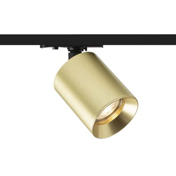 Cylindrical spotlight with GU10 socket for LED light sources, including a decorative shade of brushed black brass. Different color-combinations are available by purchasing additional shades in other colours. For use with 1-circuit tracks.