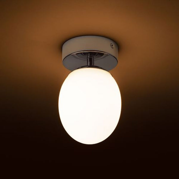 Ceiling light with integrated LED and an opal-colored glass shade. The ceiling base comes in chrome or matte nickel versions. Suitable for wet environments.