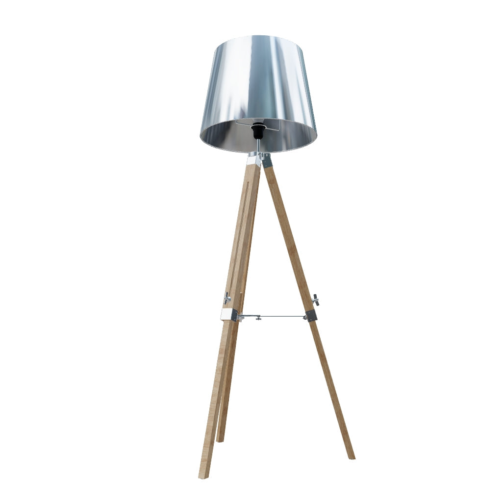 A floor lamp with a shade made of chrome foil. Has a height-adjustable bamboo base. Suitable for LED E27 light sources.