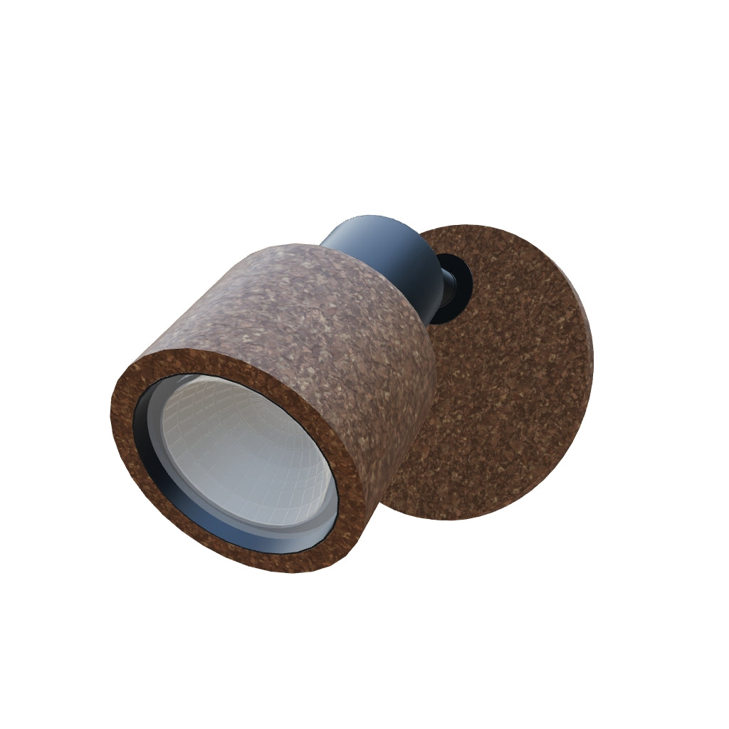 Wall-mounted spot light in a combination of natural cork and painted metal for LED light sources with a GU10 socket.