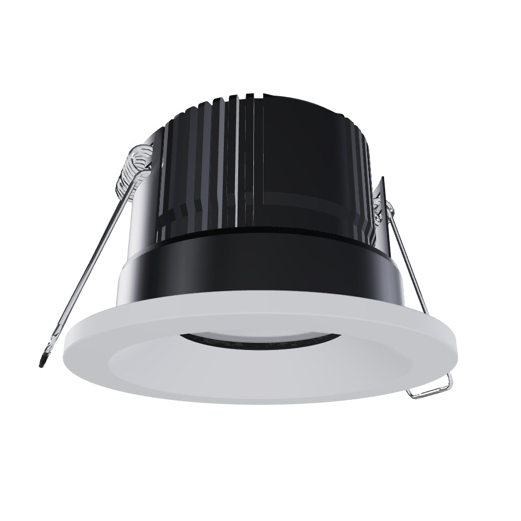 Recessed bathroom downlight for plaster ceilings with a recessed LED light source.