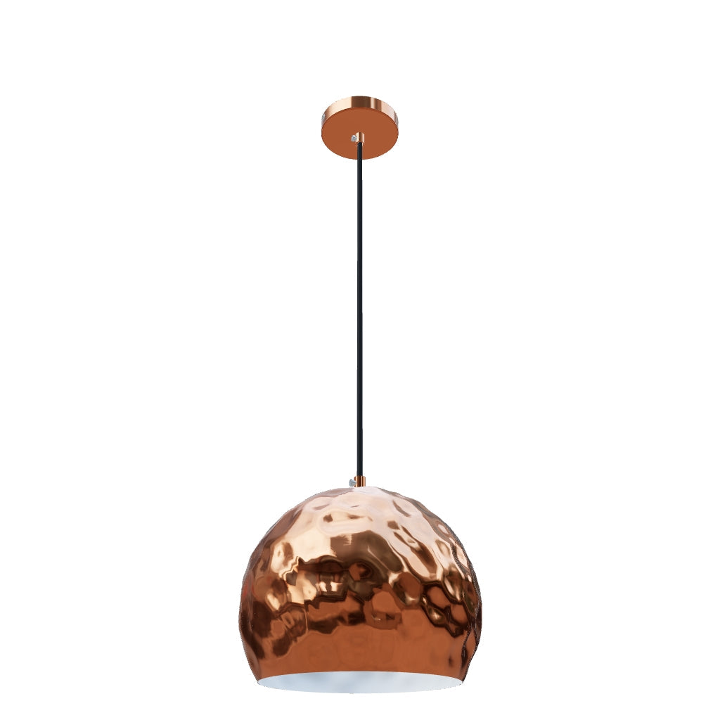Pendant with a dented metal shade. The outside of the shade is copper-colored and the inside is white-lacquered. Supplied with a black PVC-cable and matching copper-colored ceiling cover.
