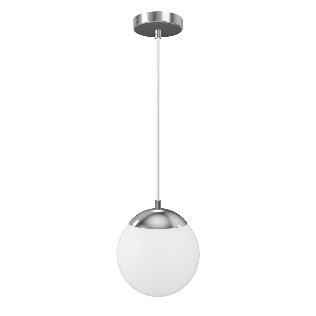 Pendant of opal-colored glass with details in chrome. Suitable for use in bathrooms.