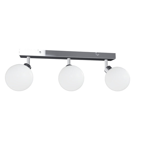 Ceiling or wall lamp of opal-colored glass on a chrome-plated base. Suitable for use in bathrooms.