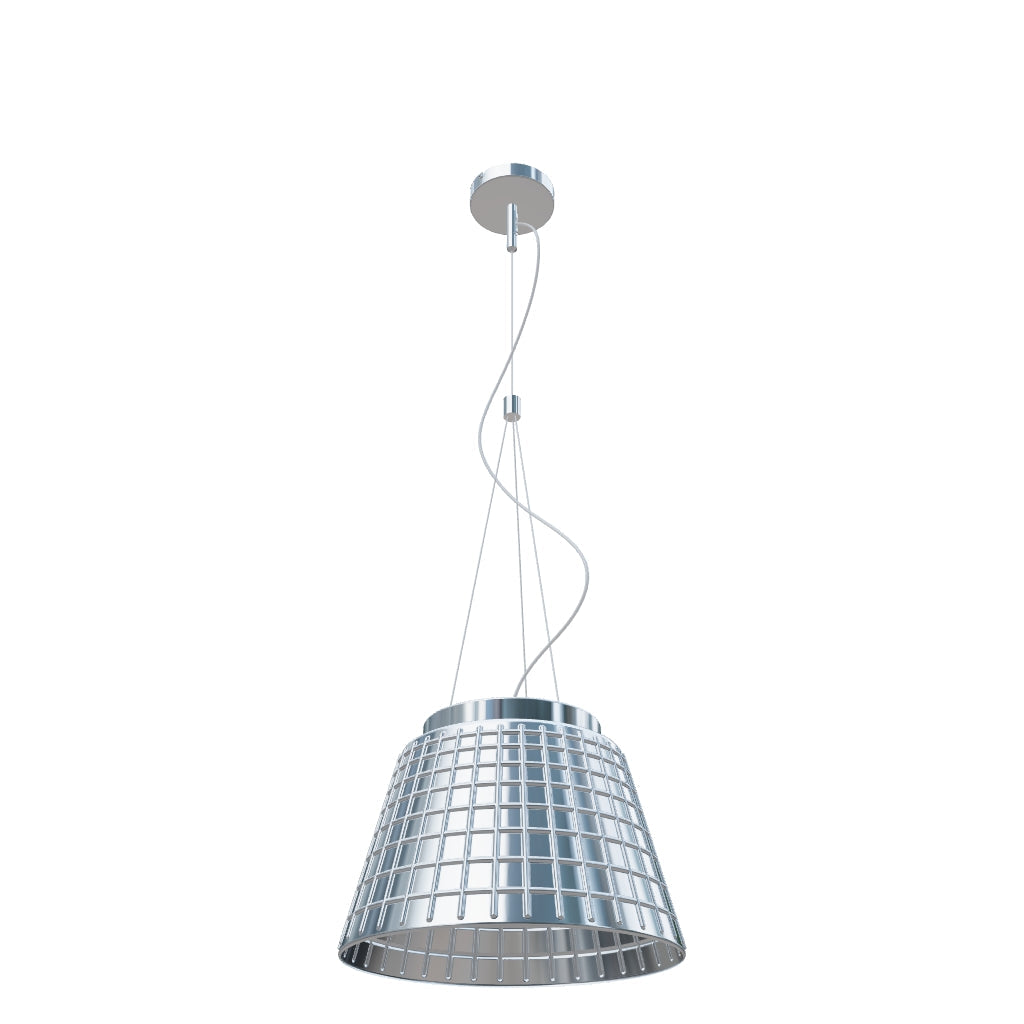 Pendant of solid textured glass. The glass is chrome-plated on both sides. When lit, the light source is partially visible through the shade.