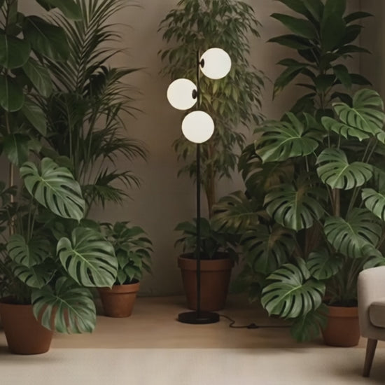 Floor lamp with three glass shades made of opal-colored glass on a black lacquered base. Suitable for G9 LED light sources.
