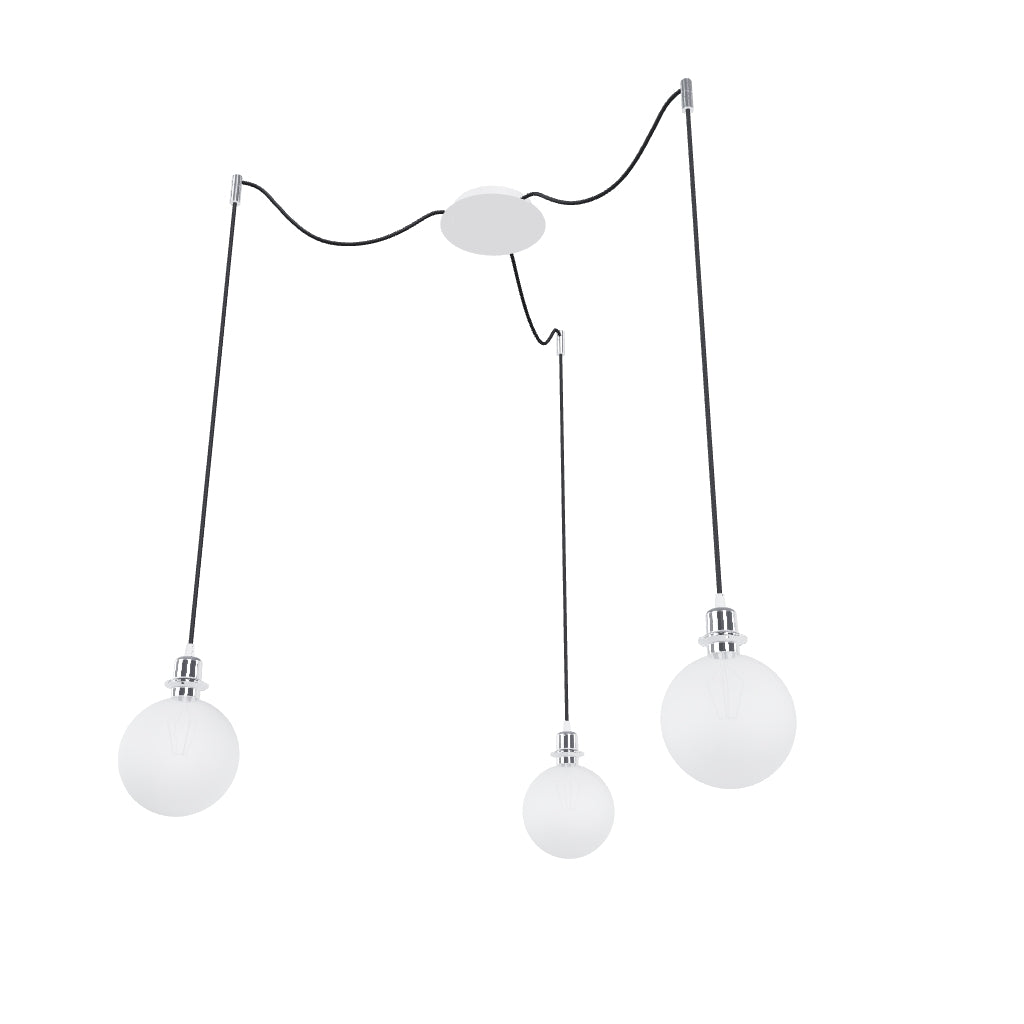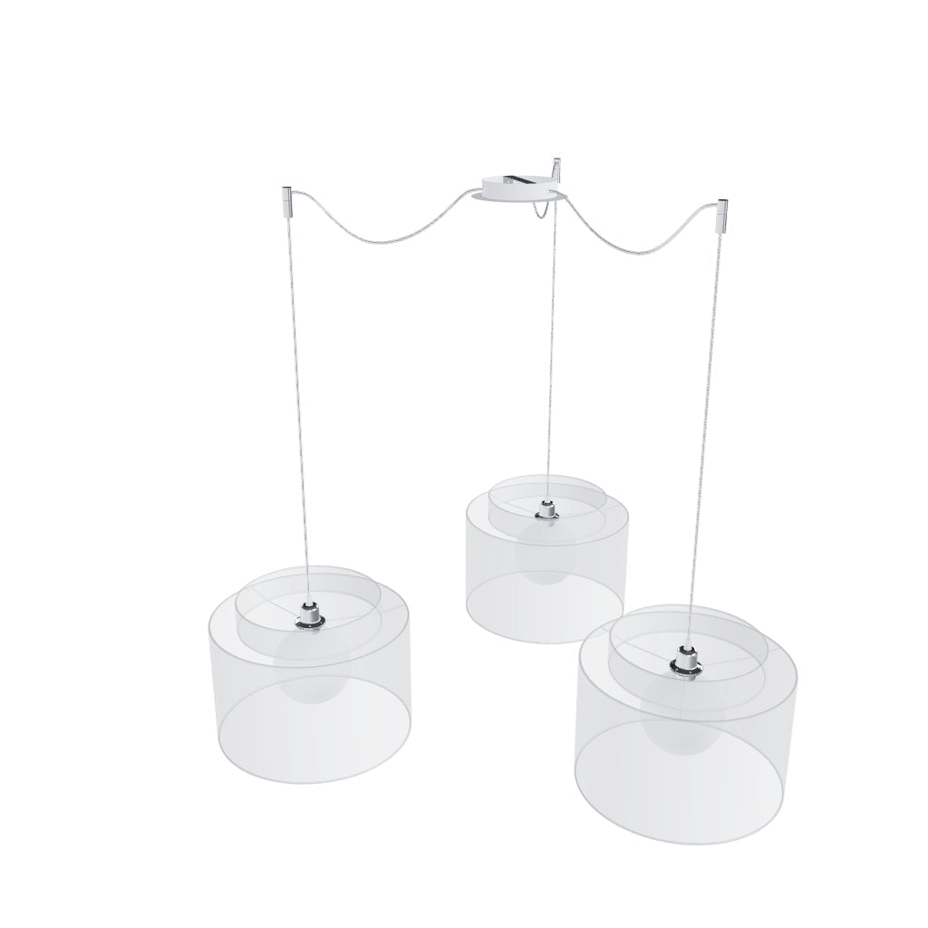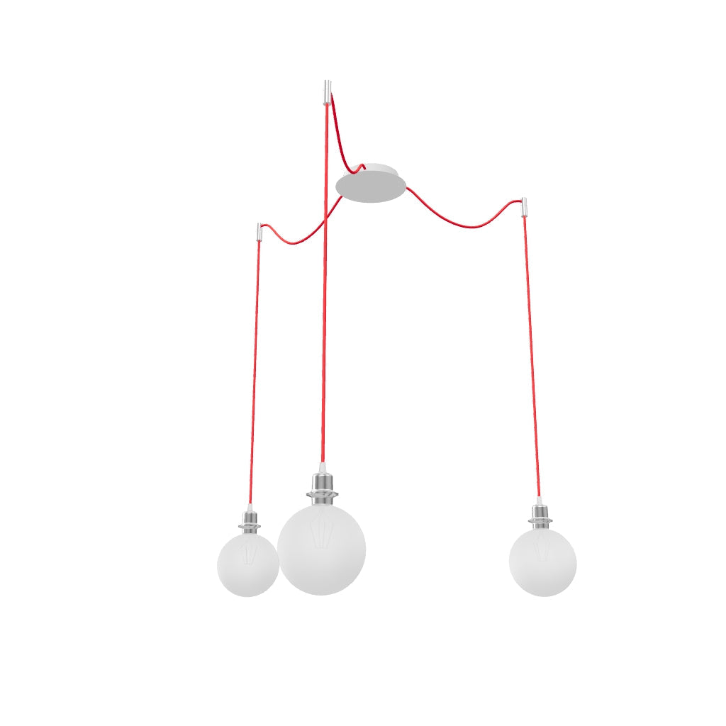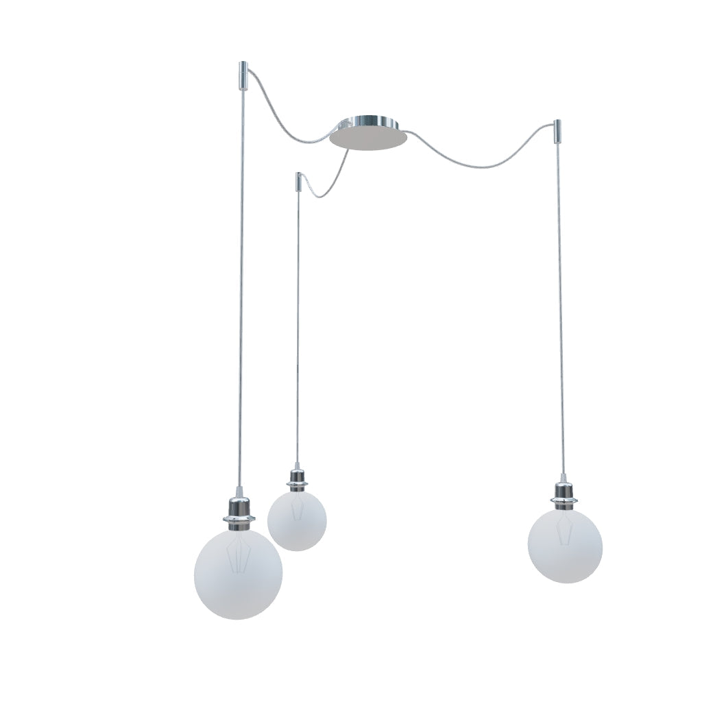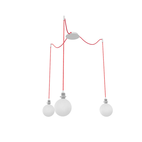 Pendant with a central ceiling base and individual textile cables with metal E27 sockets, for use with decorative bulbs or suitable textile shades. The cables are equipped with chrome-plated ceiling grips, which can be placed at an individual distance from the base. Each cable length 3m. Suitable shades: ARISTA, DELI, JAKARANDA, DOUBLE 40/30, DOUBLE 55/30, ASPRO 40/30, ASPRO 55/30, RON 15/20, RON 40/25, RON 55/30, TEMPO 15/30, TEMPO 30/19.