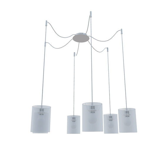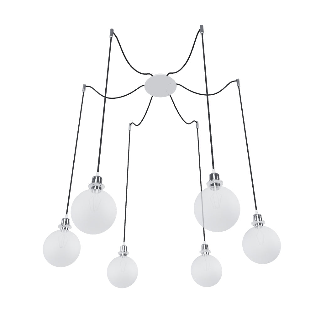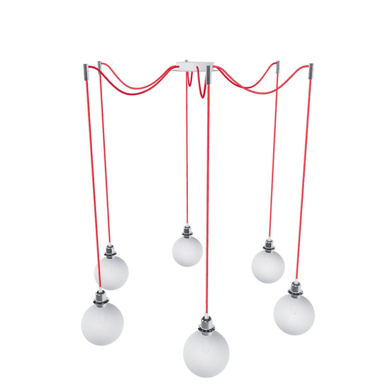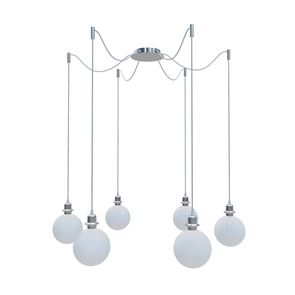 Pendant with a central ceiling base and individual textile cables with metal E27 sockets, for use with decorative bulbs or suitable textile shades. The cables are equipped with chrome-plated ceiling grips, which can be placed at an individual distance from the base. Each cable length 3m.