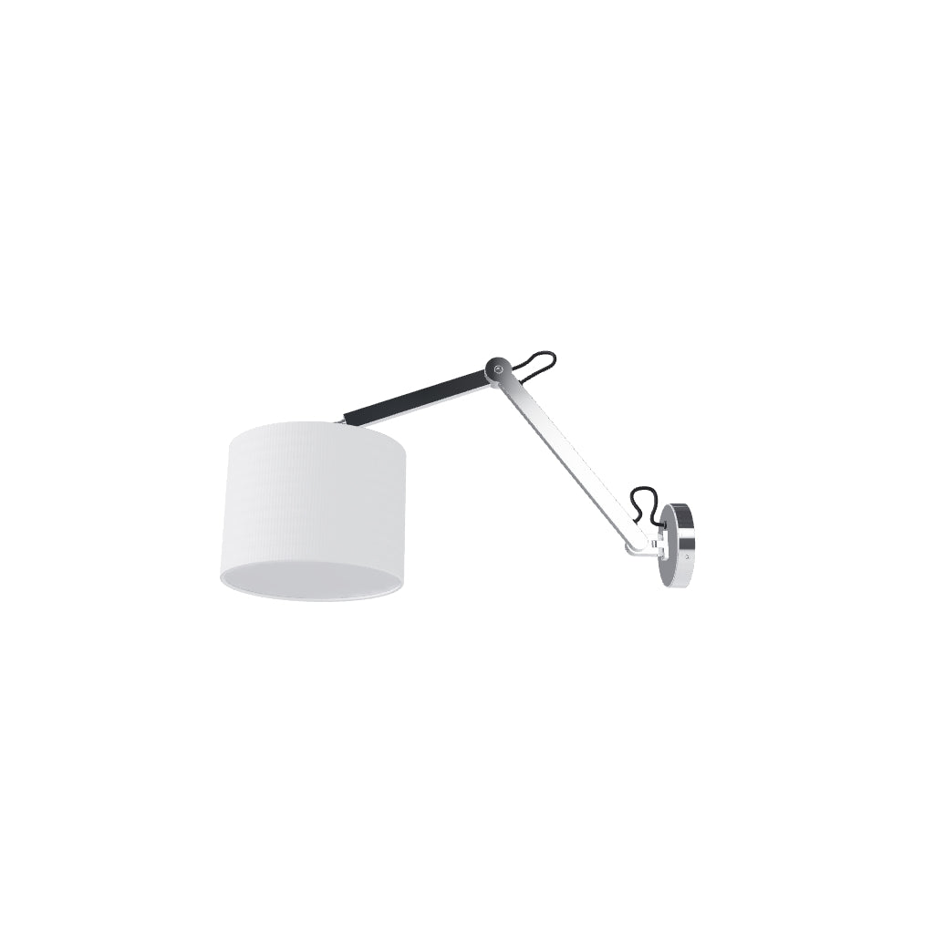 Wall lamp with a textile shade and an adjustable arm.