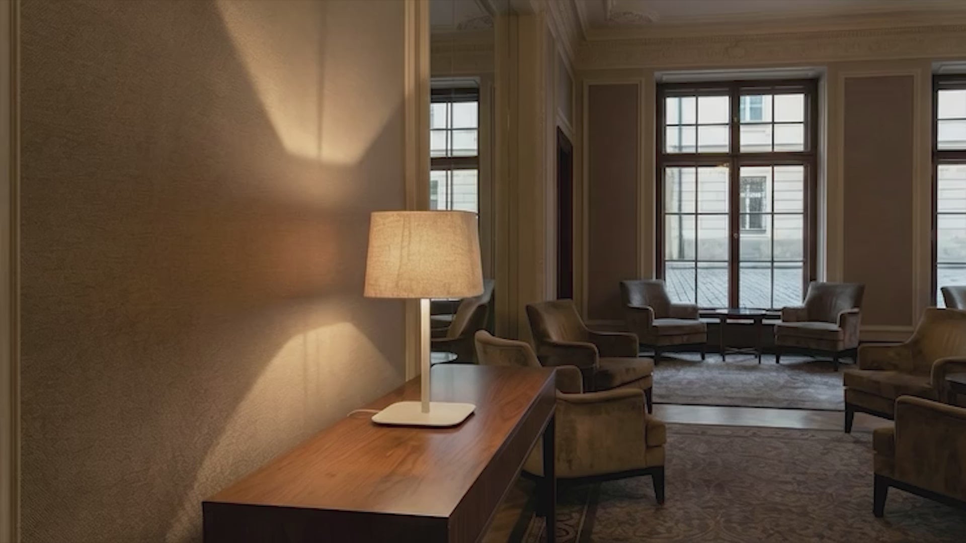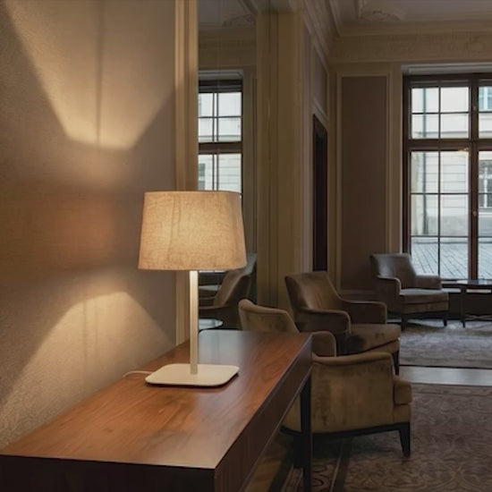 A table lamp with a square textile shade and a metal base.