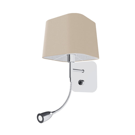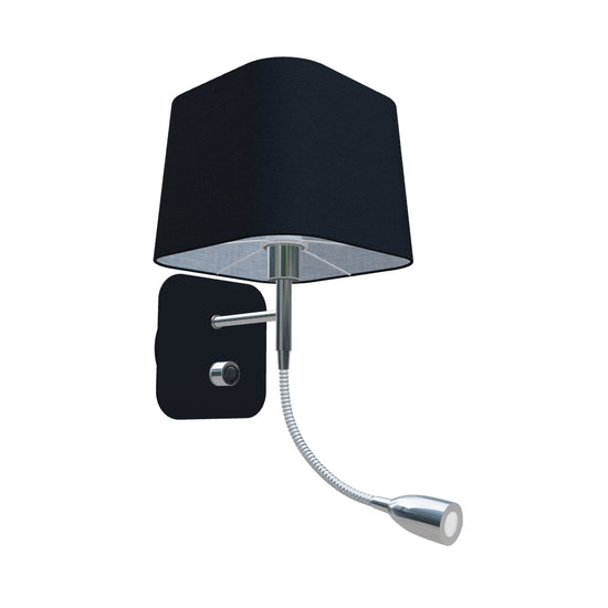 Wall lamp with an angular textile shade and LED spotlight on gooseneck. The two light sources can be controlled individually via a rotary switch on the angular base of the lamp.