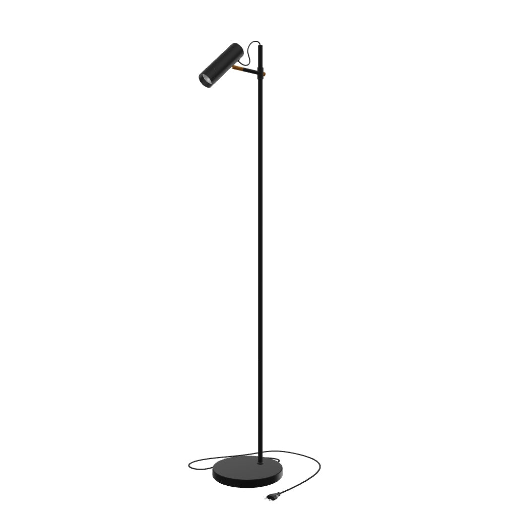 Elegant floor lamp with a cylindric head for GU10 LED light sources. The switch is located on the back of the head piece.