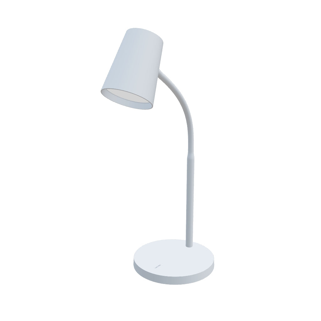 Table lamp with a conical shade, built-in LED, gooseneck arm, and a dimmer switch located at the base of the lamp. It features three-step dimming.